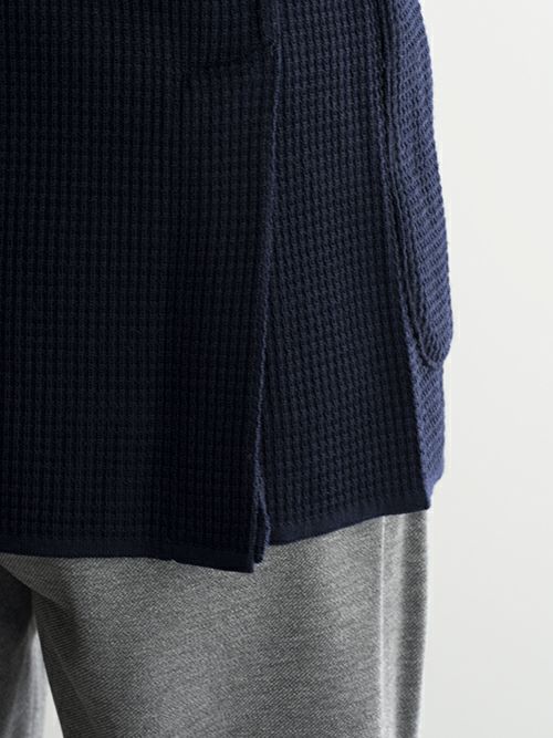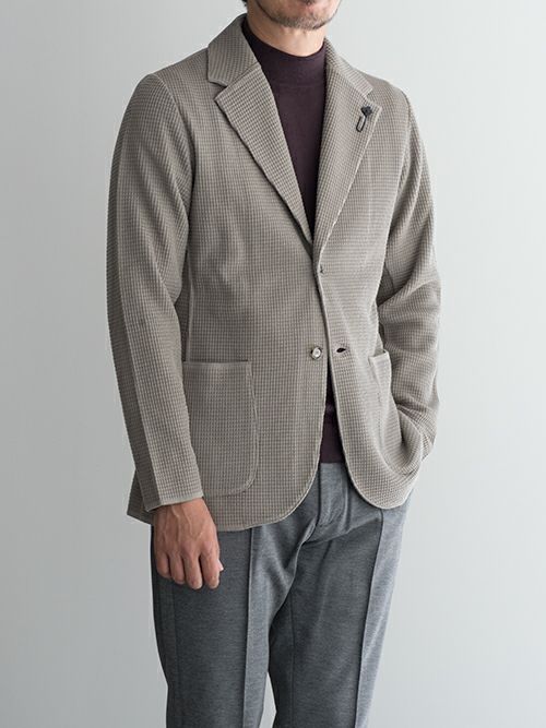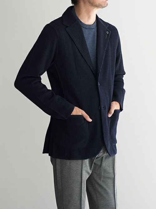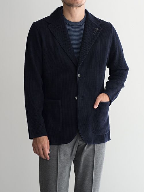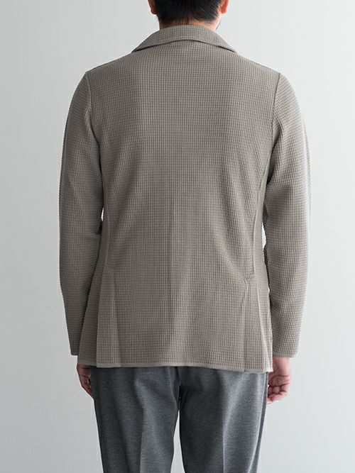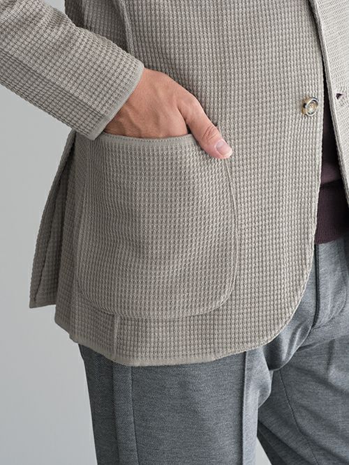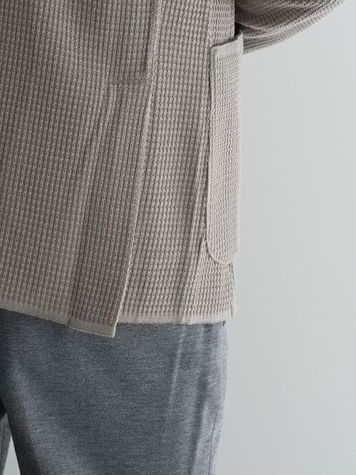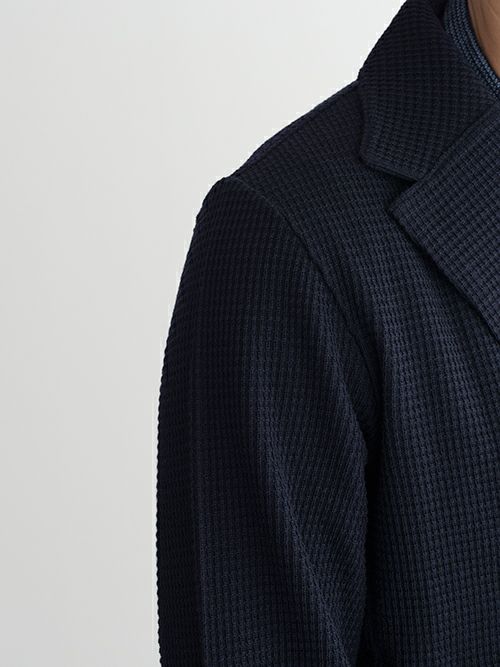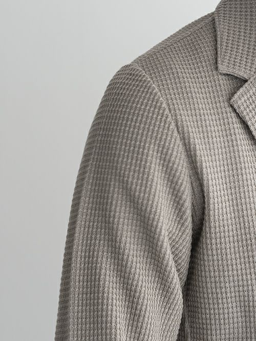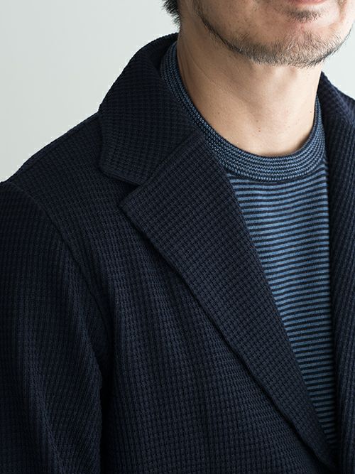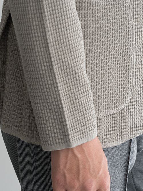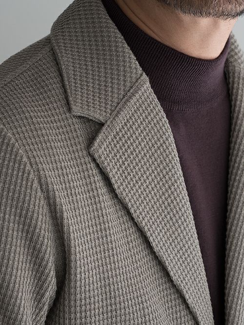 上質なウール生地を使用したニットジャケット。着用感は軽く、コーディネートのアクセントになるワッフル編みが魅力的な一着です。