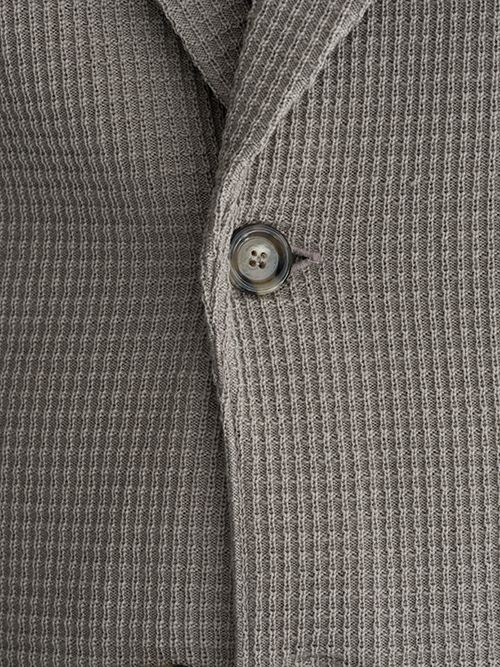 ノッチドラペルにフロントのパッチポケット、そしてサイドベンツのカジュアル且つシンプルなディテールが、生地の上質さと仕立ての良さを際立たせており、ブランドアイコンでもあるブートニエールがその名の通り花を添えます。
