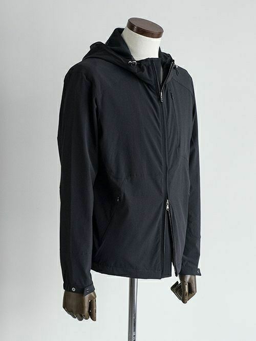 特殊な工程で縫製しており、着心地とシルエットに拘ったフードパーカー。東レのナイロンを使用した4wayストレッチ生地に、背面のテレコ素材リブをプラスする事で、様々なシーンに対応できる可動域を実現しました。同じく背面のジップを開ければ、畳んで仕舞えるパッカブル仕様なので、着心地だけでなく持ち運びにもストレスがありません。