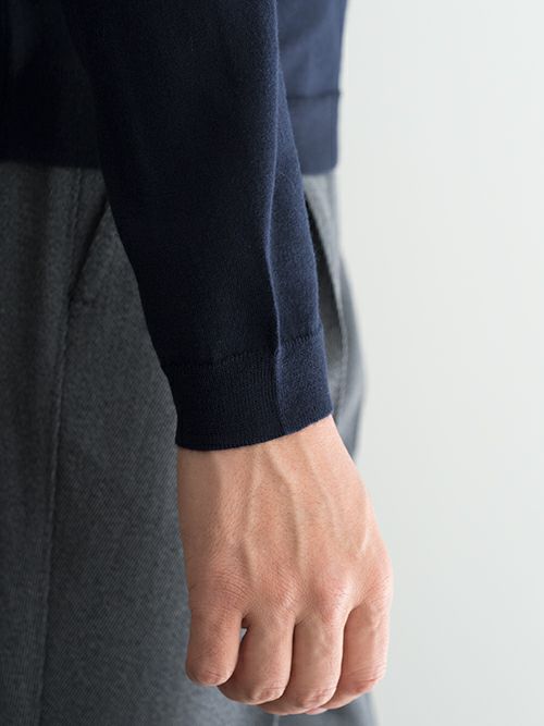 襟リブは、襟の添いを優先し襟天幅を狭くしているため、伸縮性を高めることと、シャープな見え方を意識し、敢えて重なり目を入れない拘りのディテールです。