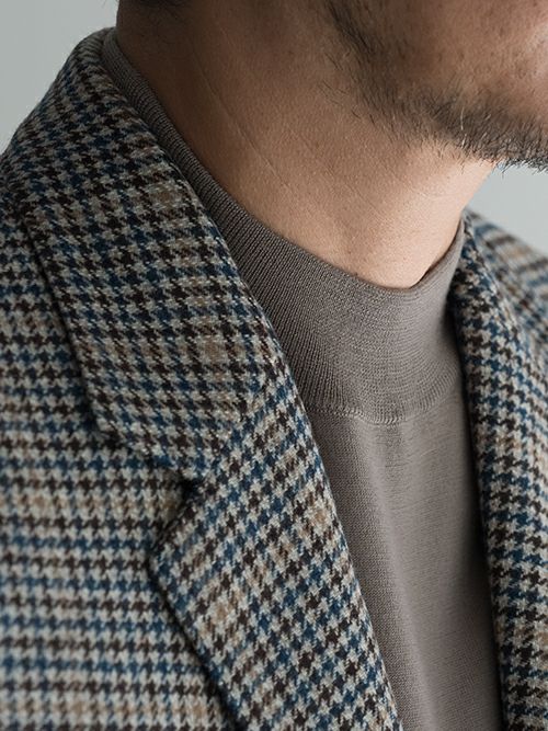 タートルネックのようなネックが高いニットが苦手な方でも違和感なく着用で きるようにネックの高さはジャケットから少しだけ覗くように調整。 ジャケット着用時に1cmほど覗くぐらいの高さにしました。 小振りなスカーフとの相性も非常に良く、スタイリングのアクセントにお薦めです。