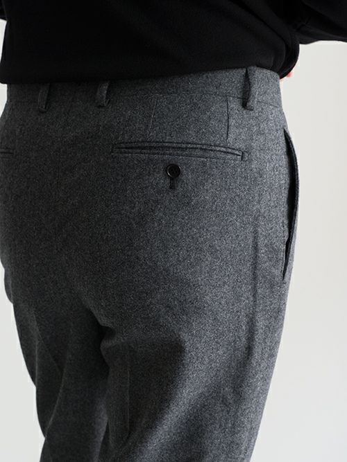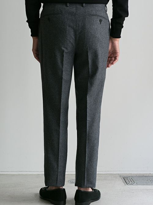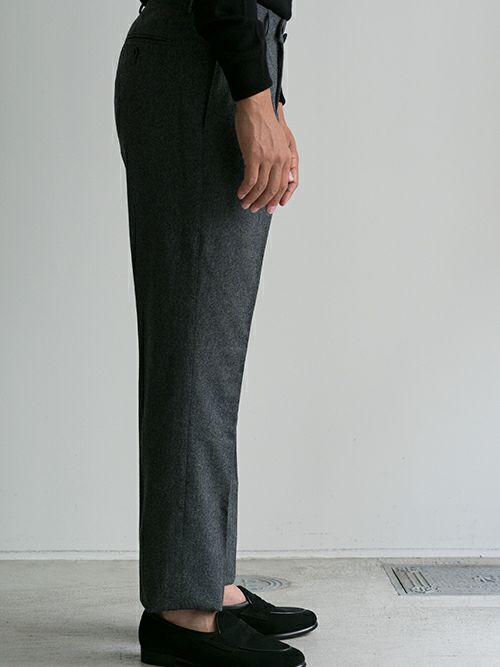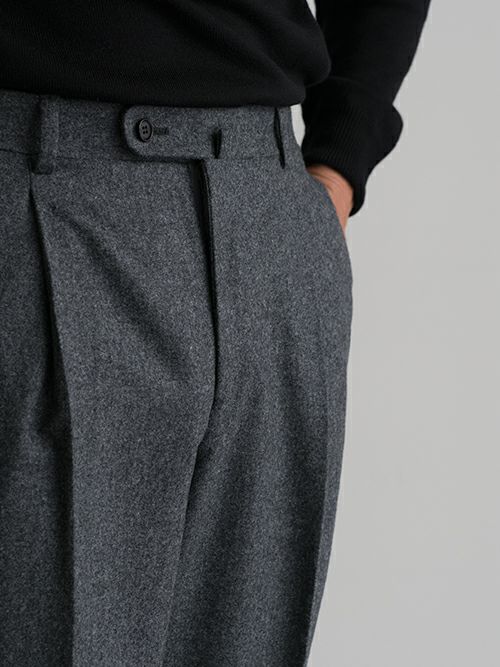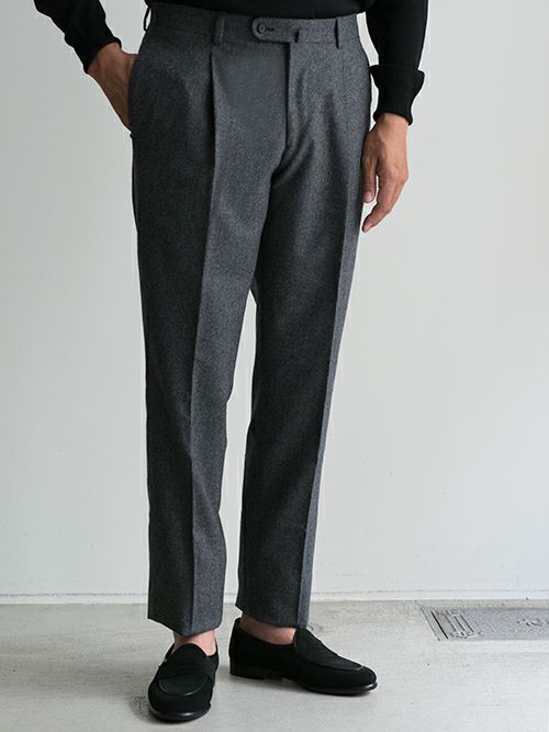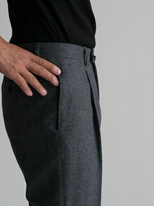腰回りには程よい余裕を持たせ、膝下はしっかりとテーパードを効かせたワンプリーツパンツ。