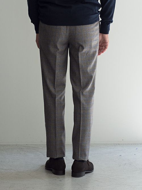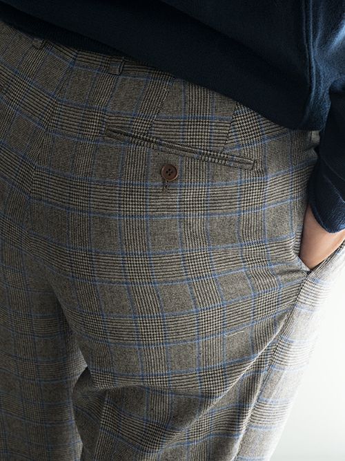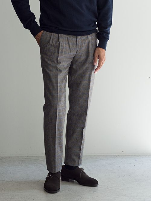 腰回りには程よい余裕を持たせ、膝下はしっかりとテーパードを効かせたツープリーツ秋冬パンツ。