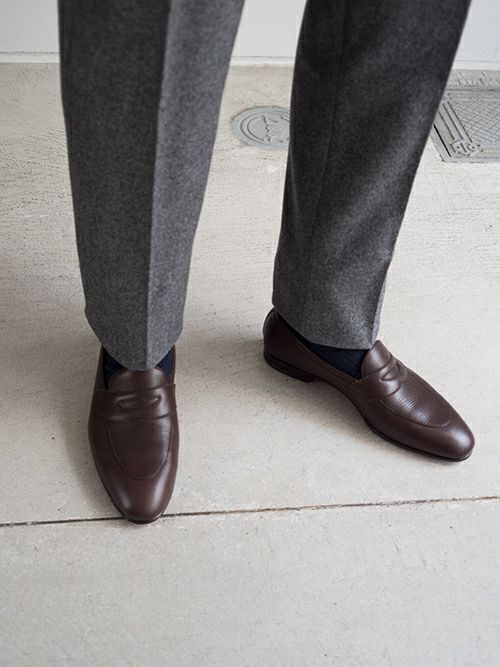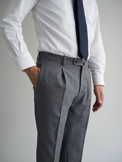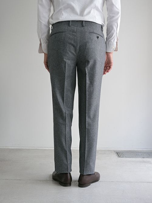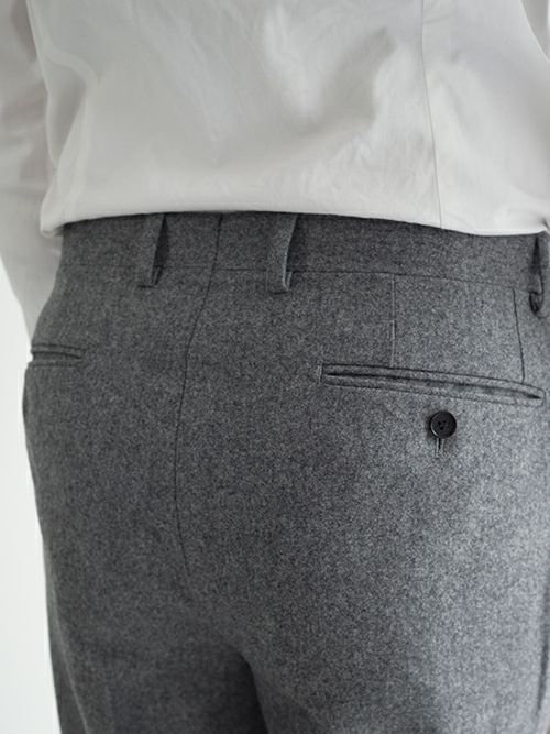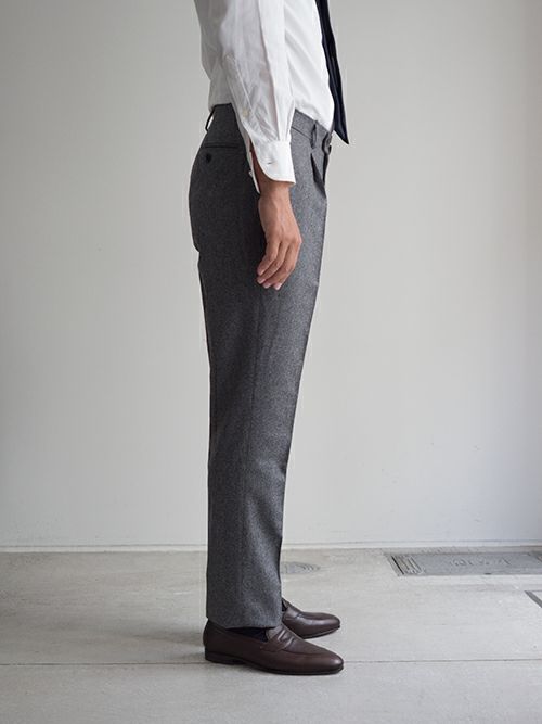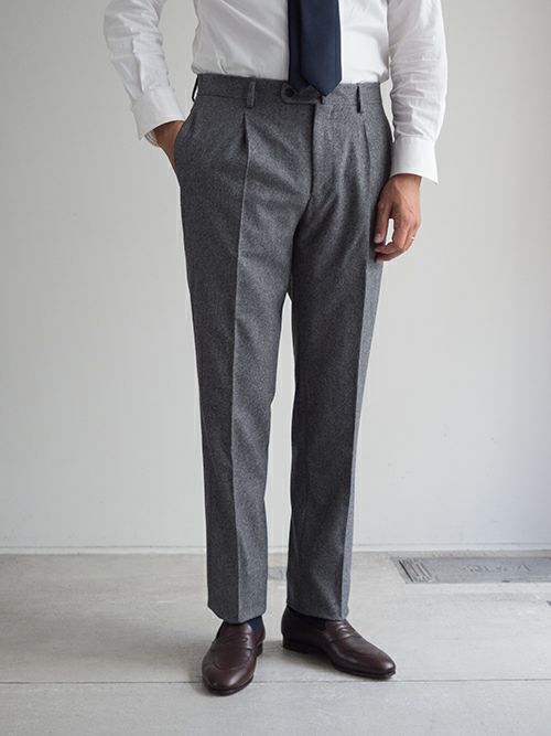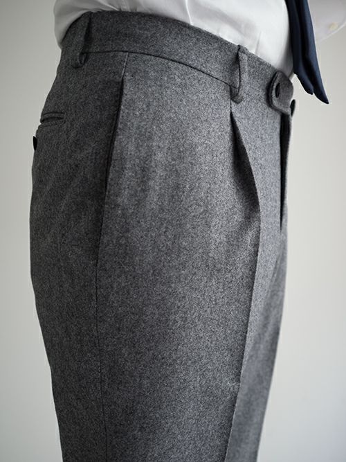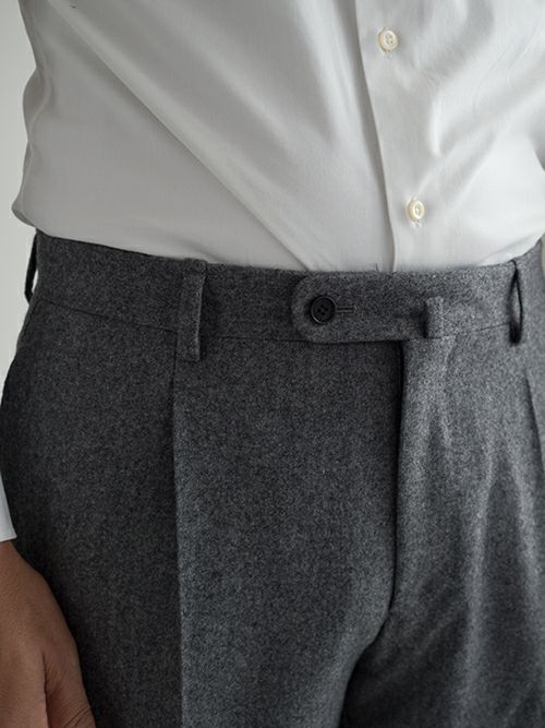 腰回りには程よい余裕を持たせ、膝下はしっかりとテーパードを効かせたワンプリーツパンツ。