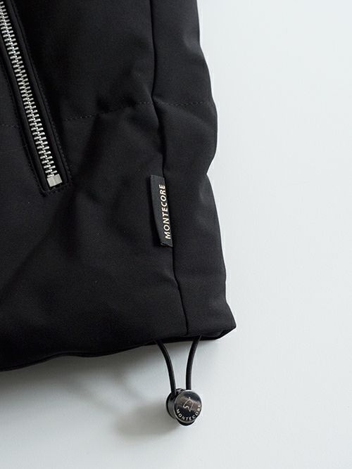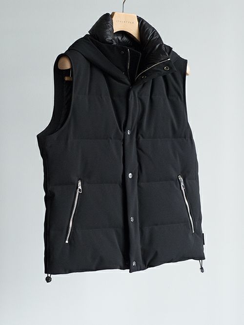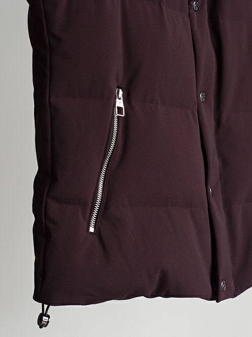表地はストレッチ素材で着心地もよく、光沢のある生地感が上品なダウンベスト。シルバーメタルのパーツも上品な印象です。フードや裾部分にドローコードが施されており、フードの立ち上がりも調整することが可能。ニットやブルソンとのレイヤードもおすすめです。