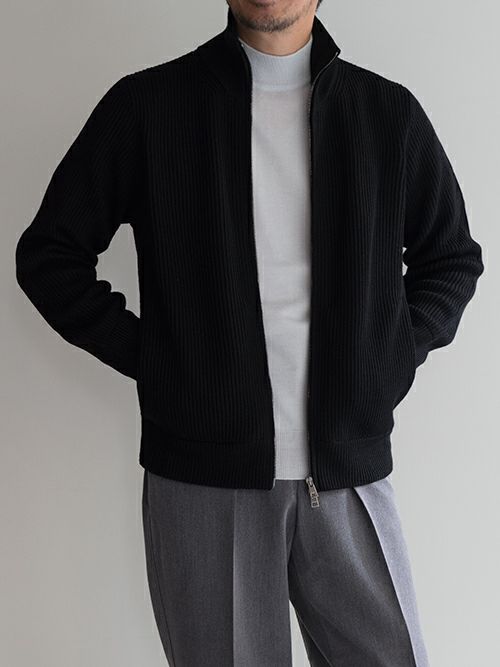 メリノウール100%のドライバーズニット。ダブルジップ仕様、サイドポケット完備、リブ編みによる立体感と伸縮性で、使い勝手が抜群の一着です。
