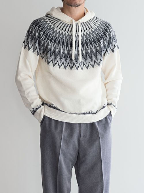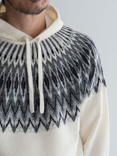 ウール、アルパカ、ナイロン混のニットフーディー。ノルディック柄がどこかレトロな雰囲気を演出しつつ、決して幼い印象にならないバランス感覚が抜群のデザインです。