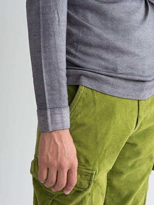 柔らかな肌触りと、製品染め特有の絶妙な色合いが魅力的な一着。勿論コーディネートの汎用性は高く、インナーとしてもスタイリングのアクセントになる一着です。