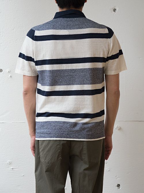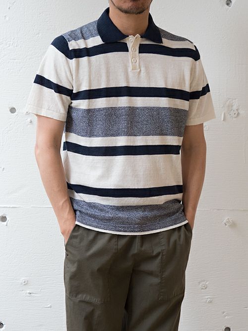 マルチボーダーですが、ネイビーとオフホワイトのカラーリングが品の良さを演出、1枚でのスタイリングに最適なニットポロです。