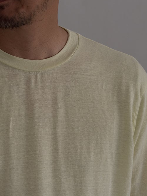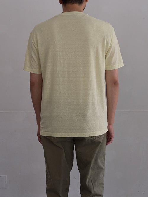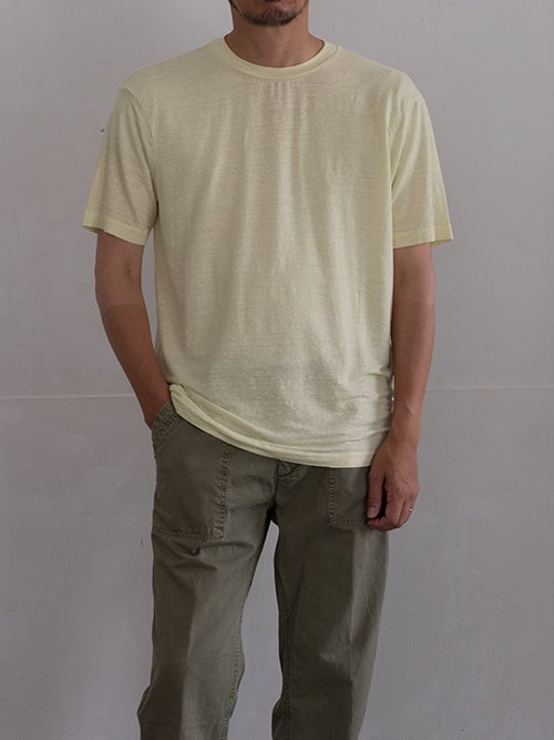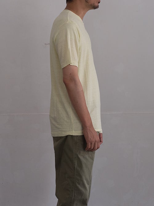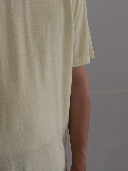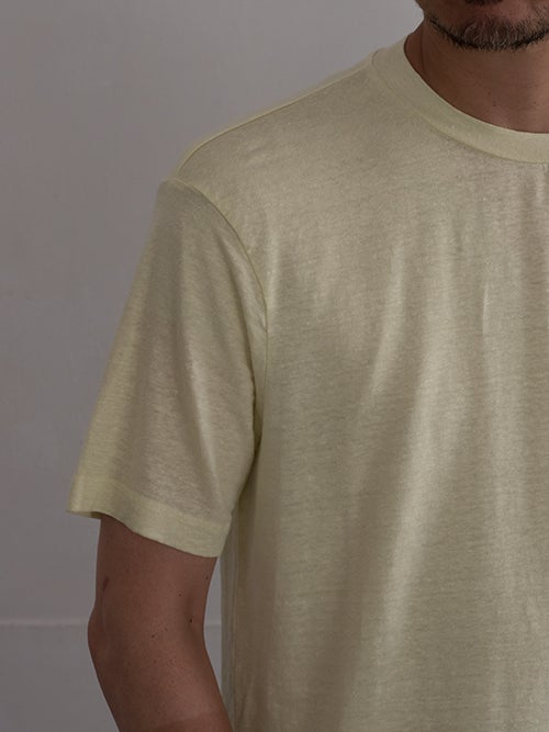 リネンのストレッチ素材で、イエローカラーのリネンTシャツ。 綿密な縫製によって上品な風合いに仕上がっています。