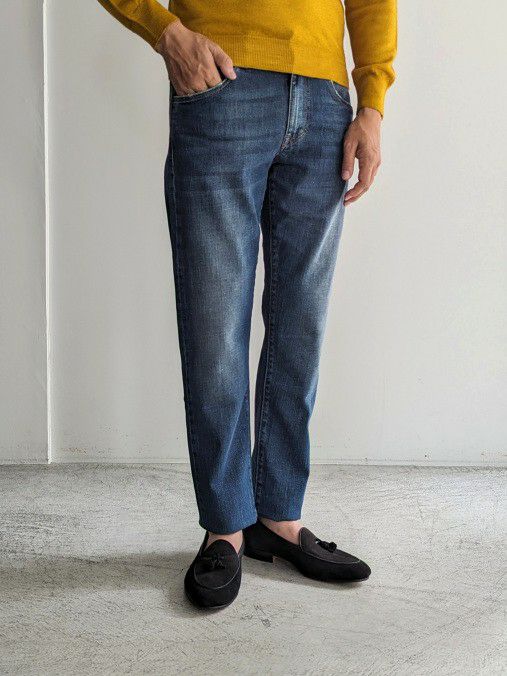 カジュアルだけでなく、ジャケットスタイルとも相性の良い一着です。ウォッシュ加工仕上げですので、何年も穿き込んだようなヴィンテージ感ある表情をお楽しみいただけます。フロントはジップフライ仕様。
