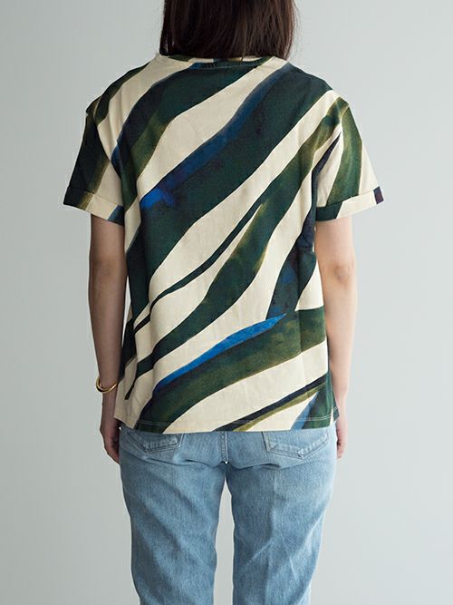 全体に入る縞模様の柄はペイントのような優しさを感じるプリントTシャツ。