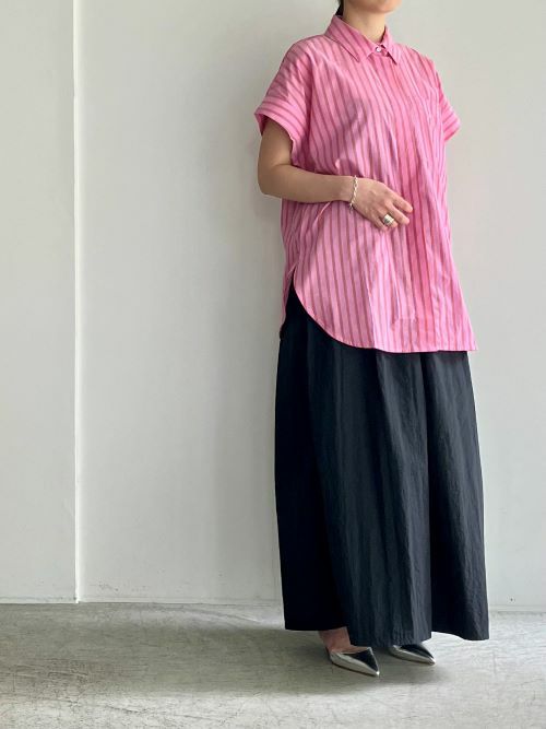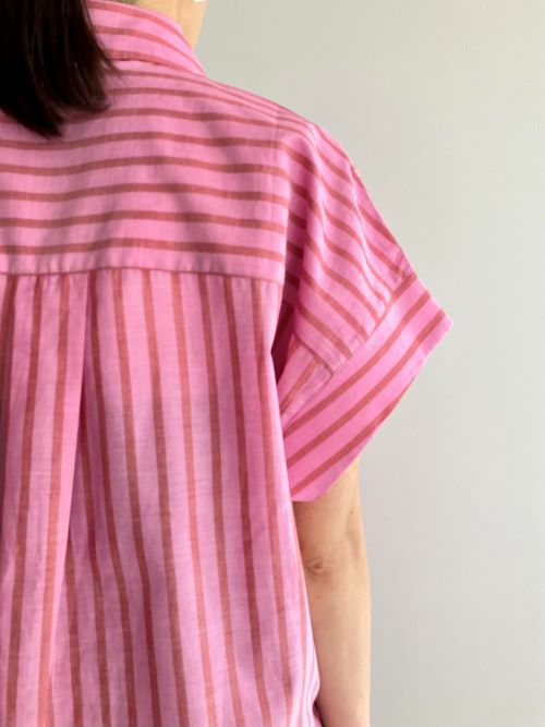 はっきりしたピンクとレッドの比翼タイプのストライプシャツ。やわやかなコットン素材で、一枚で主役になるデザインで存在感の放っています。