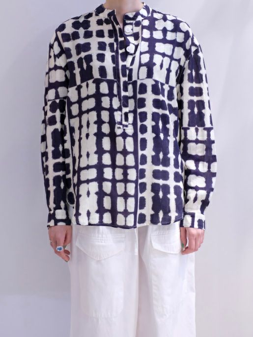 一見染め物と見間違ってしまうほど、精巧なプリント柄のプルオーバーブラウス。フェミニンになり過ぎないディテールが好印象ながら、とろみのあるレーヨン生地が程よく女性らしさも演出してくれます。