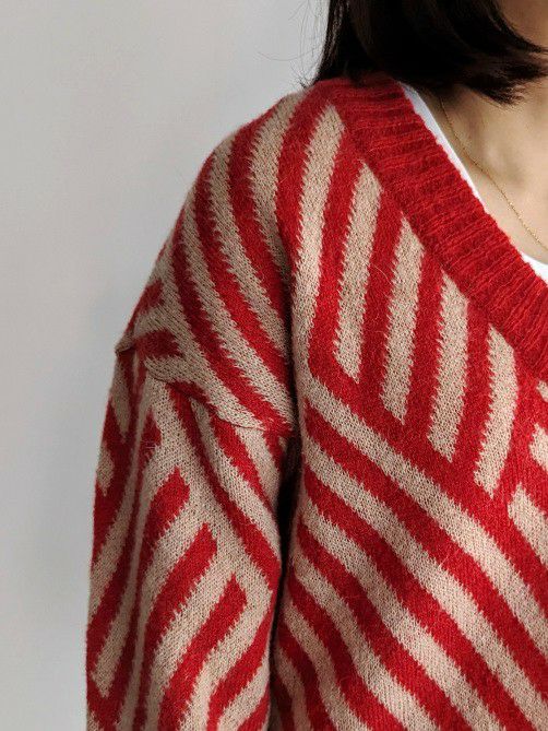 レトロな雰囲気漂うミドルゲージのVネックニット。