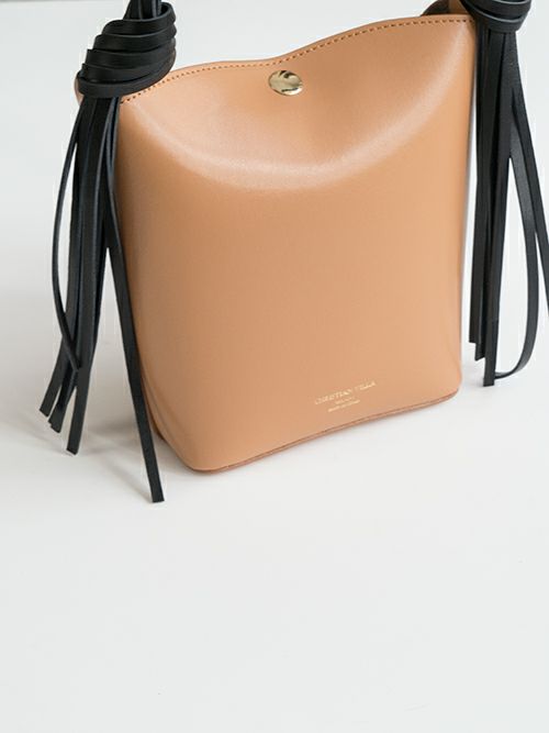 両サイドに垂れたレザーフリンジが印象的なバッグ。フリンジは取り外せて、結ぶ位置で長さ調節も可能。好みの長さで持つことが出来ます。マチがあるのでしっかり必需品も収まり、上部釦仕様でセキュリティもしっかりしていて安心して使えます。シンプルながらも存在感があり、様々なコーディネートに華を添えてくれるバッグです。