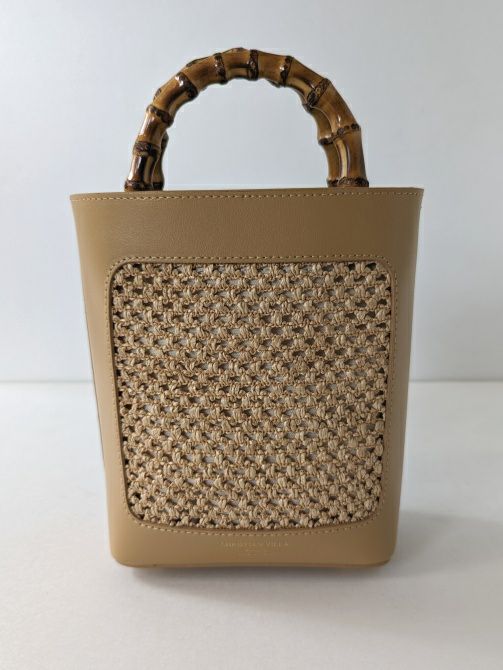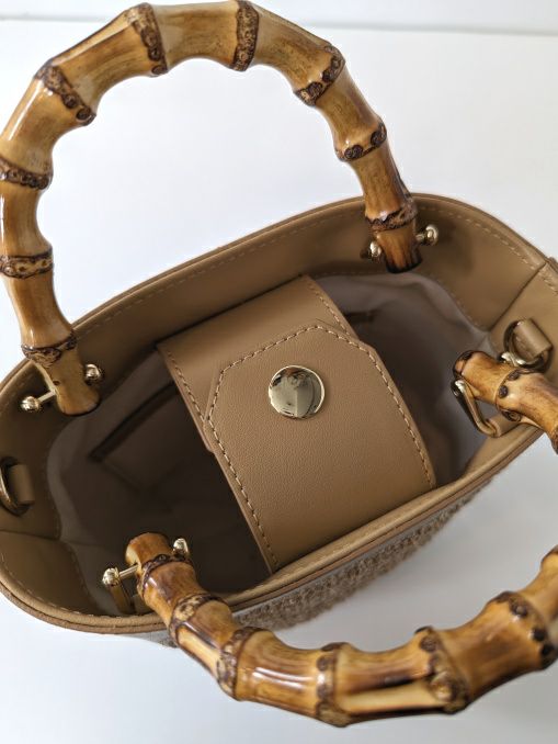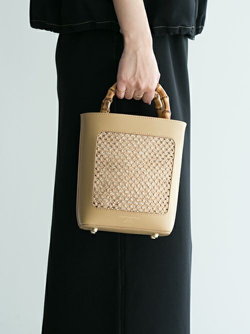 バンブー素材とラフィアのカジュアルな印象を、上質なレザーと組み合わせる事により、カジュアル過ぎず洗練された大人のバッグに格上げしています。着脱可能なレザーストラップが付いており、コーディネートに合わせて持てるのも嬉しいポイント。レザーとラフィア素材で春夏にぴったりのバッグです。