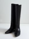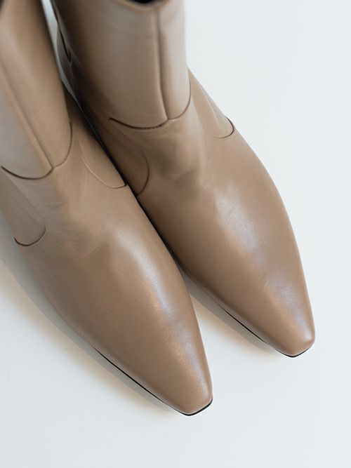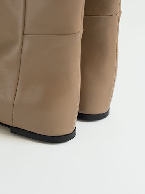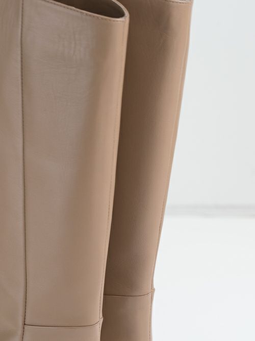 フラットソールに見えますが、かかと部分に約2センチのインヒールが入っており、足が疲れにくい構造になっています。トレンド感のある少し太めの筒なので、スカートやワンピースはもちろん、パンツと合わせたブーツインのスタイリングもおすすめです。