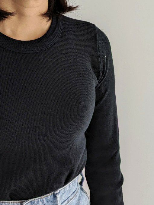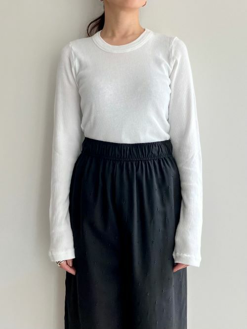 コットン100%のリブクルーネックカットソー。全体的にインナーようにタイトなサイジングにしてありますが、肌触りも柔らかく程よく馴染んでくれます。着丈は長めになっていますのでボトムにインして頂くとスッキリと着用頂けます。ネック部分は開きすぎず程よいネックの開き感です。ホワイトは多少の透け感がございます。シャツワンピースやニットカーディガンのインナーに活躍するアイテムです。