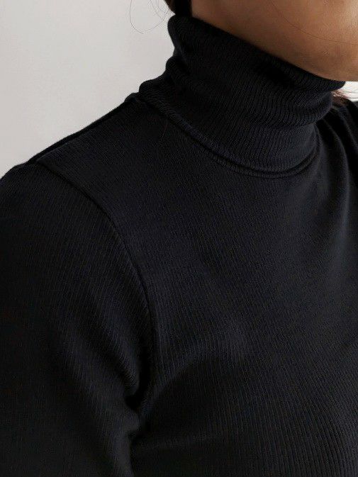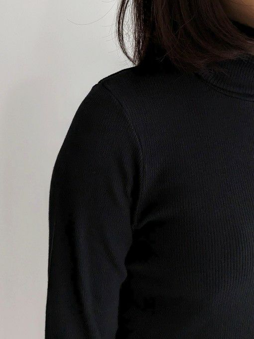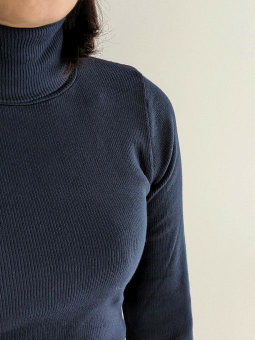 コットン100%のリブタートルネックカットソー。全体的にインナー用のタイトなサイジングにしてありますが、肌触りも柔らかく程よく馴染んでくれます。着丈は長めになっていますので、ボトムにインして頂くとスッキリと着用頂けます。