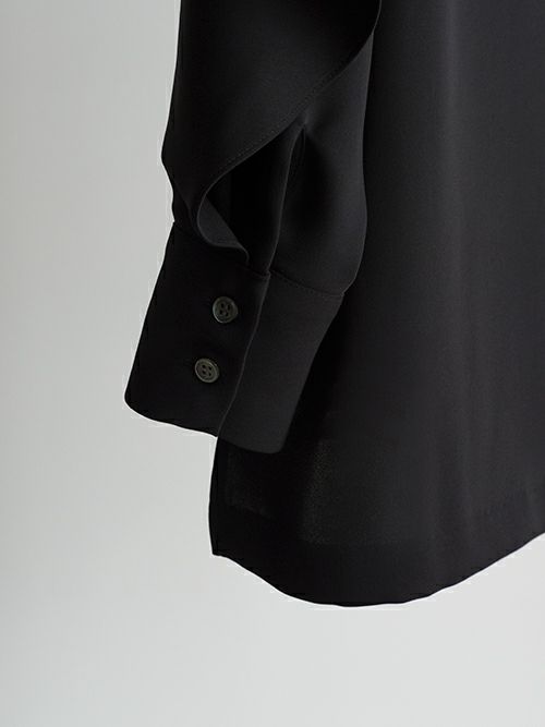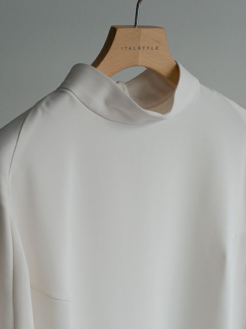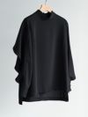 背中から袖にかけたフリルが印象的なブラウス。ハイネックのデザインととろみのあるポリエステル素材が甘くなり過ぎずに、上品な雰囲気で着て頂けます。カジュアルシーンはもちろん、フォーマルにもおすすめの一着です。