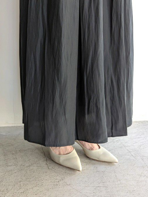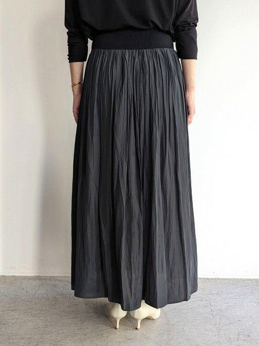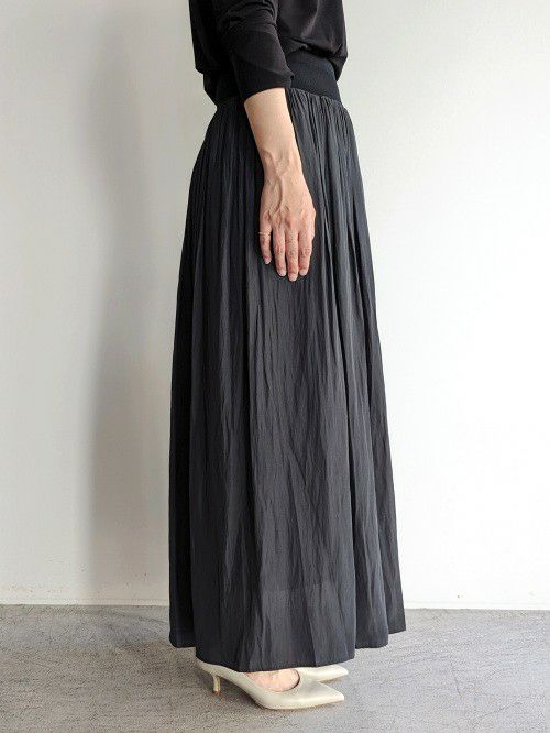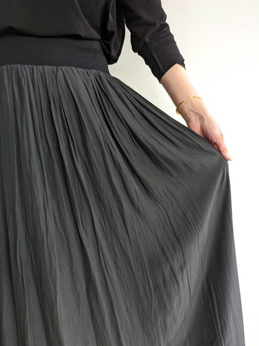 上品なサテン地を使用したロングスカート。動くたびにふんわり揺れる女性らしいシルエットを演出。ウエストマークのリブゴム仕様なのでカットソーやブラウスをインしたスタイルもキマります。