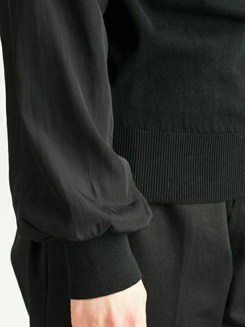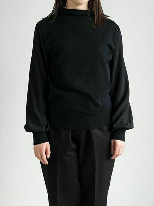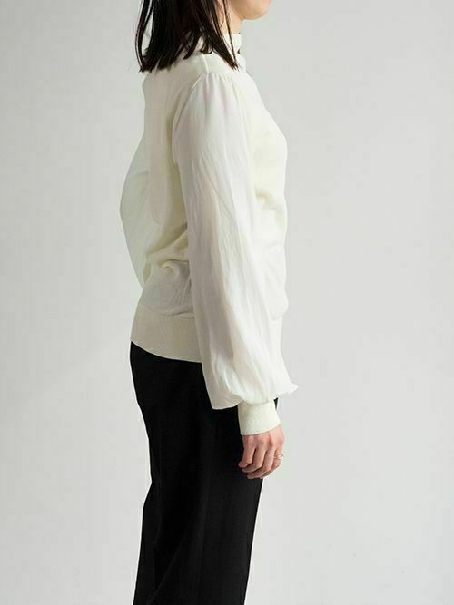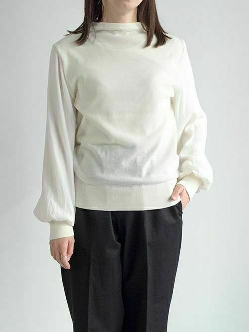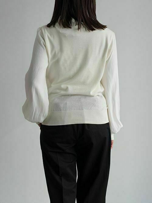 クラシカルなネックラインと柔らかいチュール素材で上品な印象のニットです。袖部分は透け感がなく、色々なシーンで重宝するアイテムで、きれいめからカジュアルまで幅広く着て頂けます。