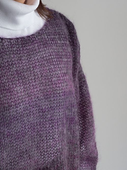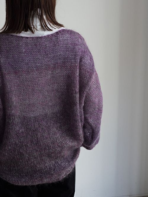 2本の高級キッドモヘヤを引き揃え軽さと温かさを同時に追求した、ロングピッチのカスリ染め糸を使用したニット。透け感があり重ね着を楽しめるゆったりしたニットです。