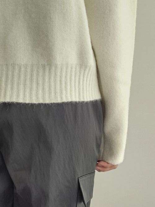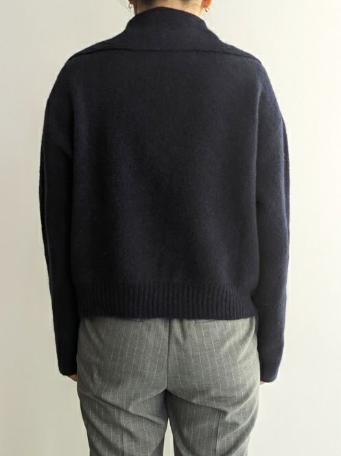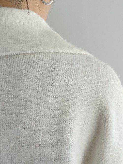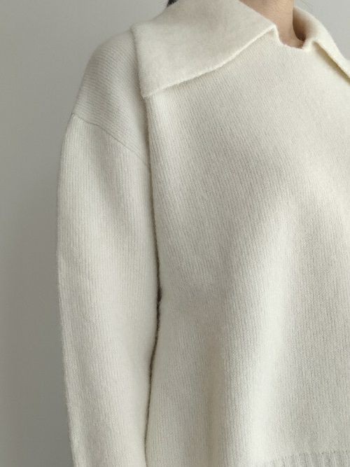 大きな襟が特徴的で、洒落感と愛らしさがあふれるニット。トレンドのビッグシルエットで、着丈はショートになっています。
