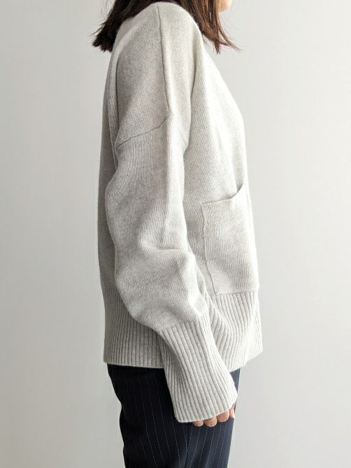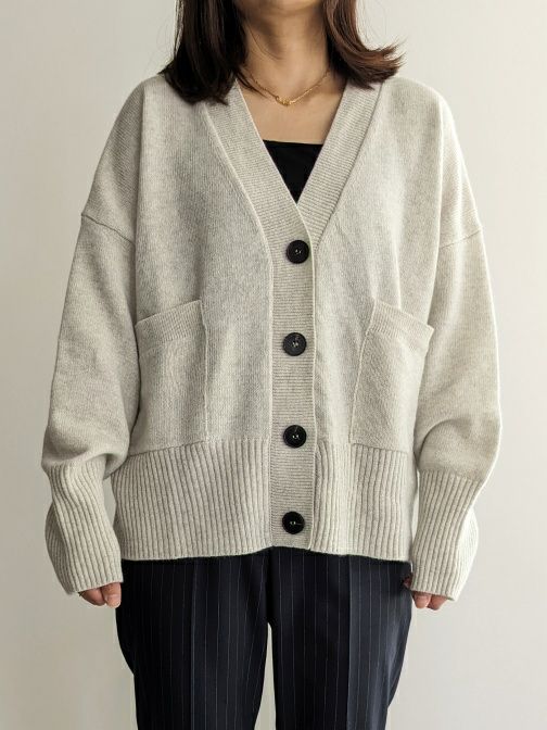 ウール、カシミヤ混の柔らかく温かなニットカーディガン。シンプルなデザイン故に、生地の上質さが際立つ一着です。