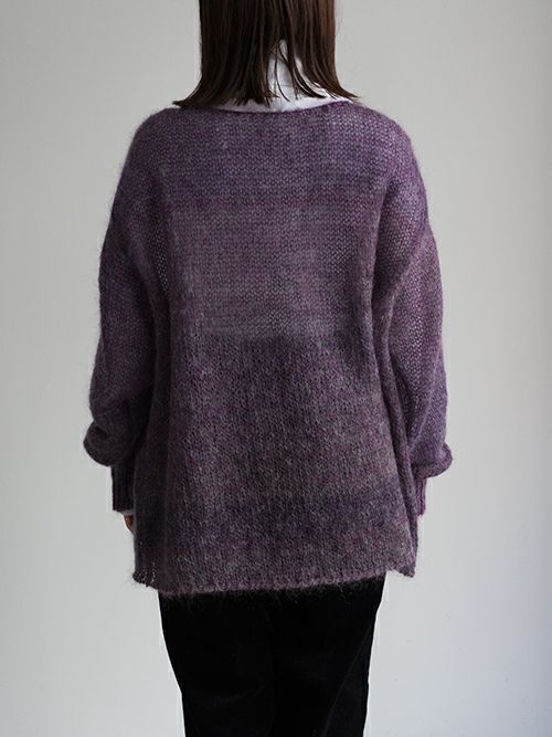 2本の高級キッドモヘヤを引き揃え軽さと温かさを同時に追求した、ロングピッチのカスリ染め糸を使用したニット。透け感があり重ね着を楽しめるゆったりしたニットです。