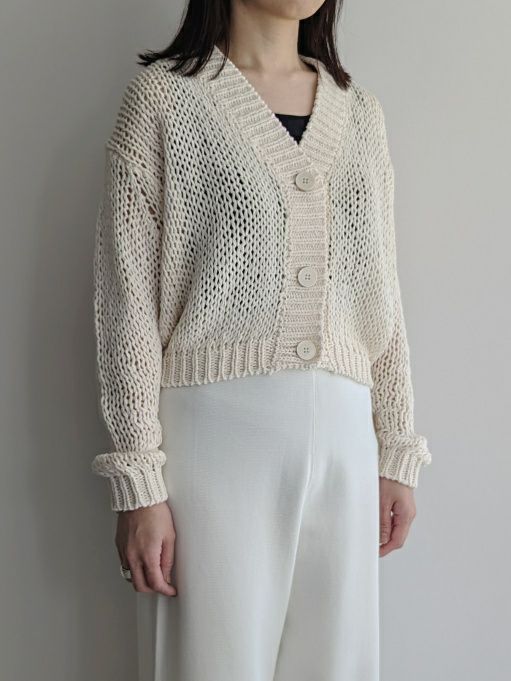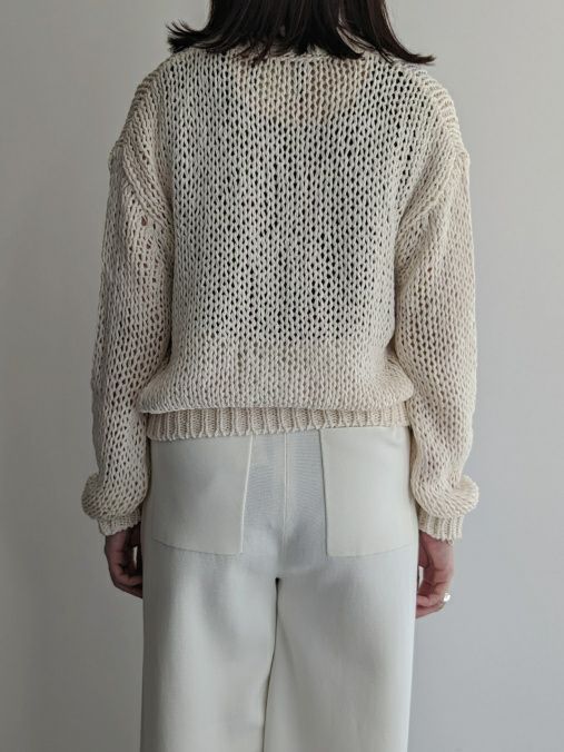 ロベルトコリーナでも継続モデル。ボクシーフィットで着心地の良さに定評があります。コンパクトで編み感とガーメントダイ(製品染め)の風合いがポイント。ガーメントダイ(製品染め)することにより編み込みのカラーも1点1点同じものがなく自分だけの1着になります。ボトムはワイドめのパンツやワンピースなどにレイヤードしてコーディネートの幅が広がります。