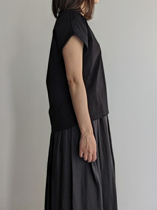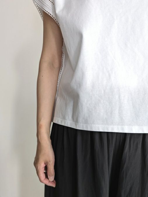 シンプルなカットソー素材に袖口から刺繍がポイントのフレンチスリーブ。同色の素材が主張しすぎず女性らしく、また爽やかな印象です。Tシャツ感覚で上品な装いにも合わせれますのでボトムを選ばずコーディネートしやすいです。