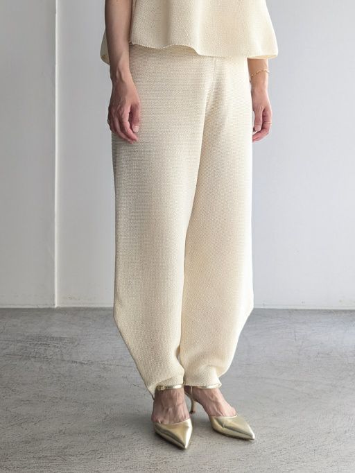 和紙素材混紡の涼やかな風合いが魅力のニットパンツ。ほどよくゆとりをもたせたバルーンシルエットが、裾にかけて自然に細く絞られ、リラックス感のあり洗練されたラインを演出します。肌にやさしい裏地付きで、心地よい履き心地。これからの季節にぴったりな、上品さと軽やかさを兼ね備えた一着です。