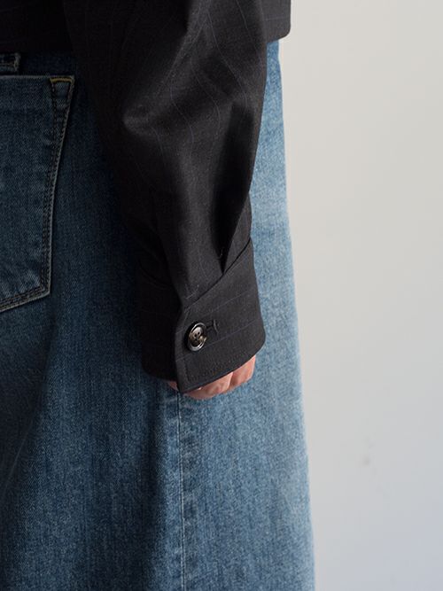 フロントはすっきりとした比翼仕立て、裏地を省いた軽やかな着心地が魅力的。ミニマルでありながらも、素材の上質さとシルエットの美しさが際立ち、洗練された中にさりげない個性が光る一着です。