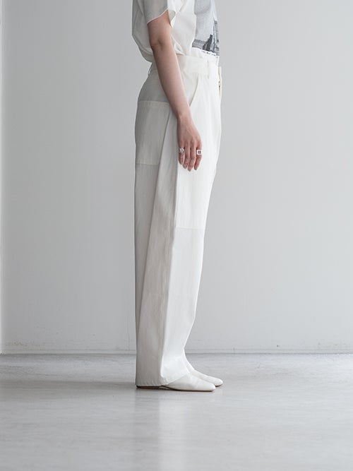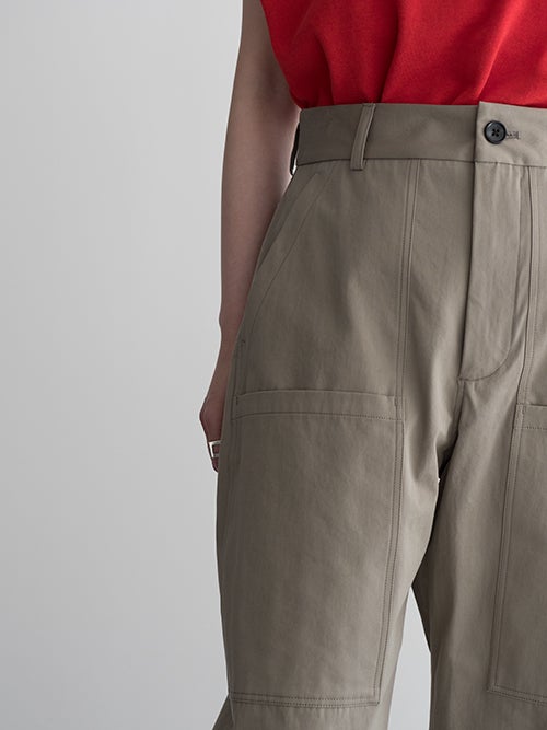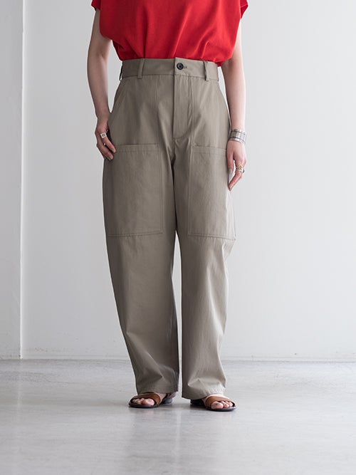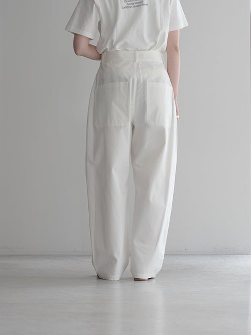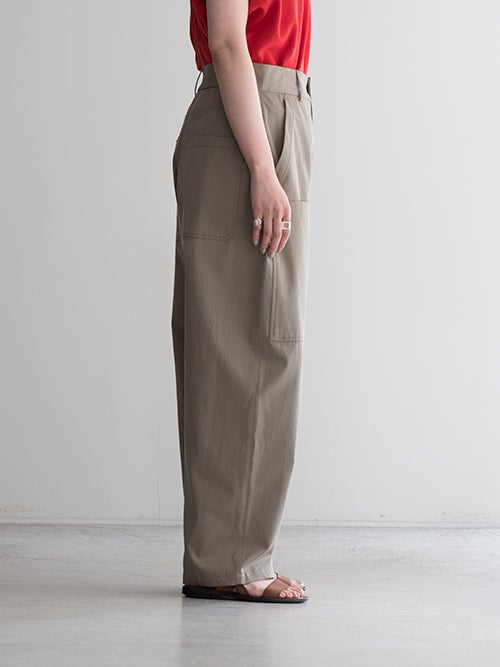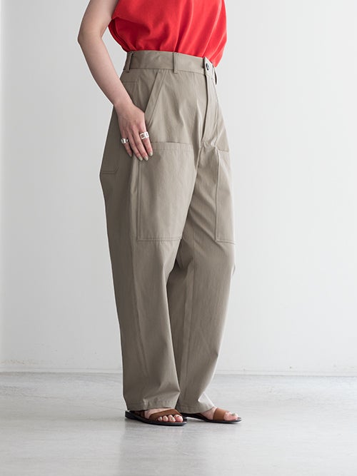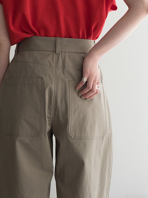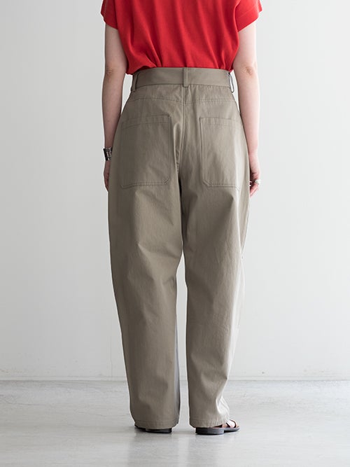 高密度に織り上げたこだわりのチノクロスを使用したバレルレッグパンツ。光沢感となめらかでしっとりとした風合いが特徴のツイル素材に洗いざらし加工でふくらみを持たせました。