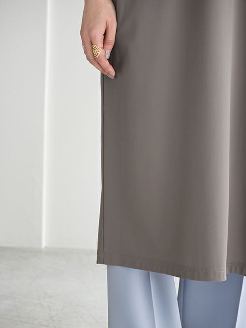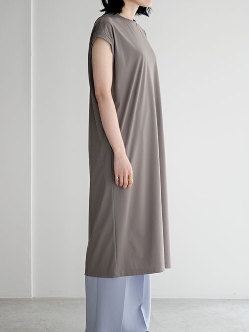 ストレッチ素材でさらりとした着心地のワンピース。片側には深くスリットが入り、パンツやロングスカートなどとのコーディネートを幅広く楽しめる一着。