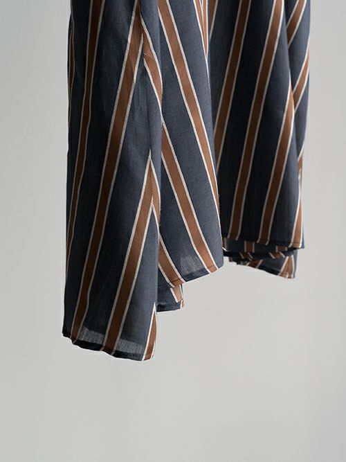 変化のある爽やかなストライプ柄がシーズンムードを高めてくれるノースリーブブラウス。裾にかけて広がるフレアシルエットで、生地にハリと程よいコシ感があり、ヒップにかかる丈なので一枚でも安心して着用出来ます。背面はハーフジップでカジュアルすぎない印象に。