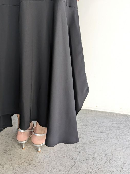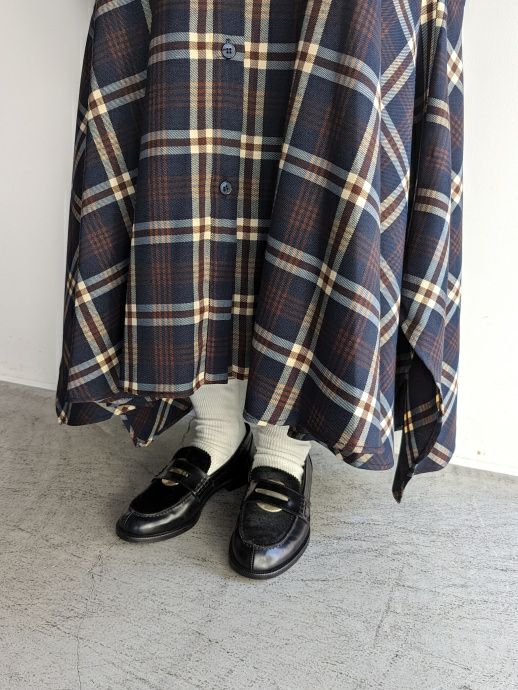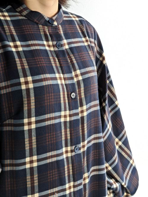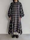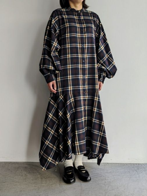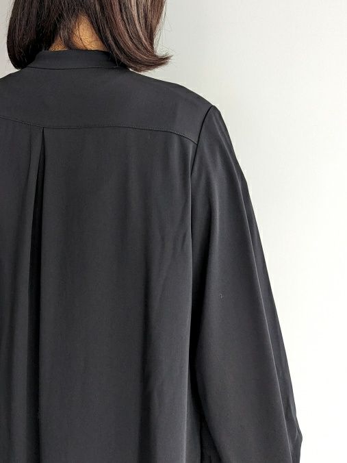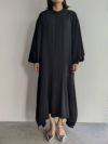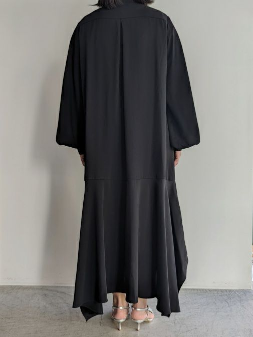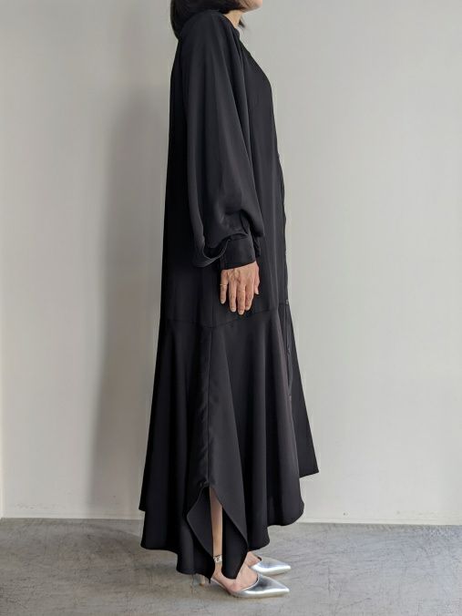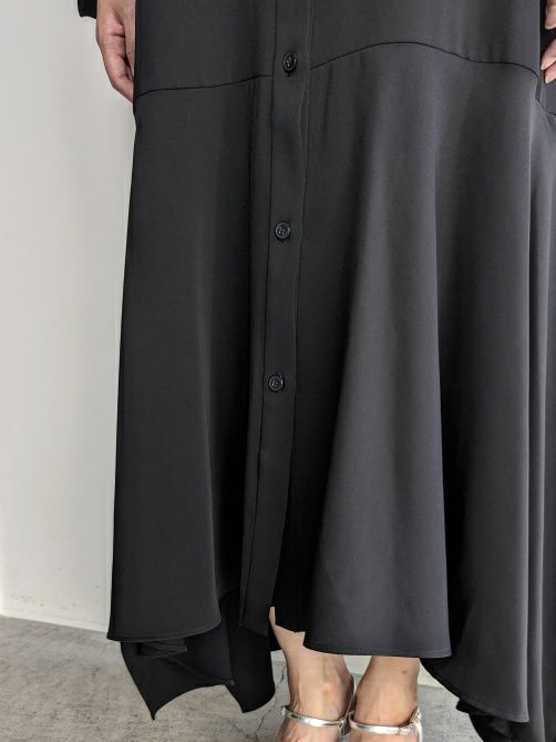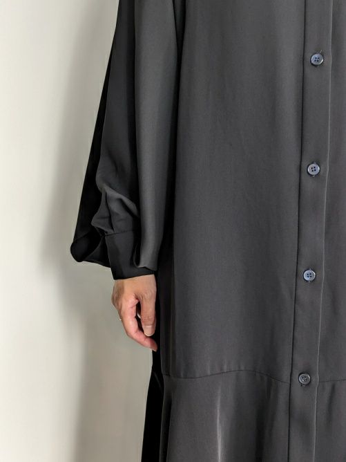 袖と裾のカッティングがポイントのシャツワンピース。アシンメトリーで足元の動きを与えてくれる裾の仕上げ。フロントはボタン仕様で、羽織としても活躍します。カフ部分はゴムを入れて日常着用しやすいように工夫されているのも嬉しいポイント。上品な落ち感があり、柔らかさと程よいハリのある生地感です。