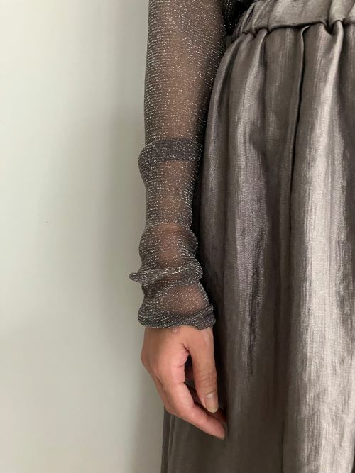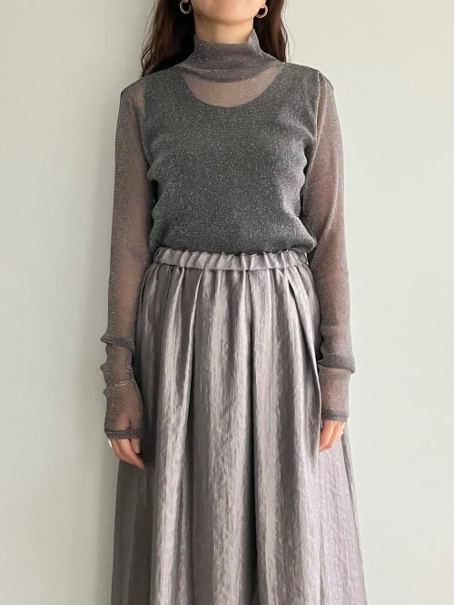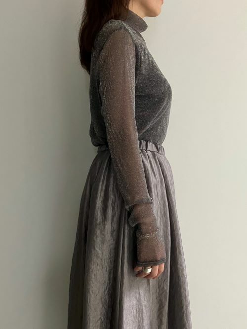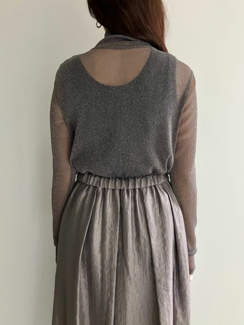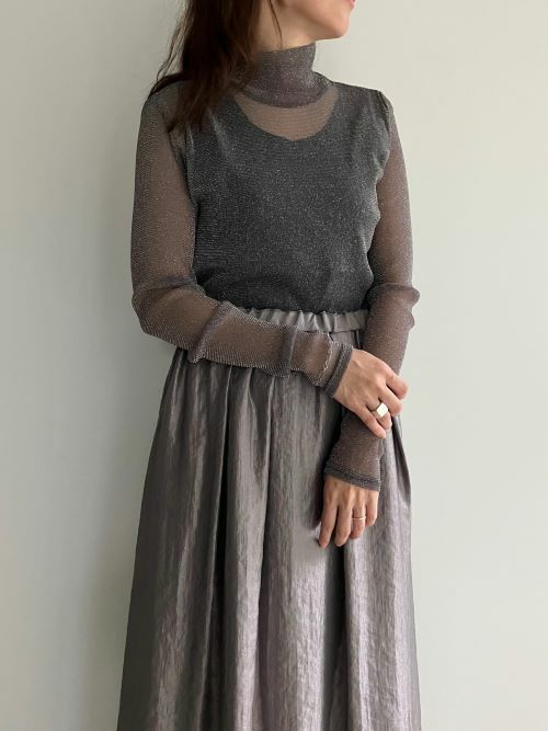 さらさらとしたラメ加工が施された透け感のある素材を使用しており、すそは巻きロック仕上げでウェーブがアクセントになります。