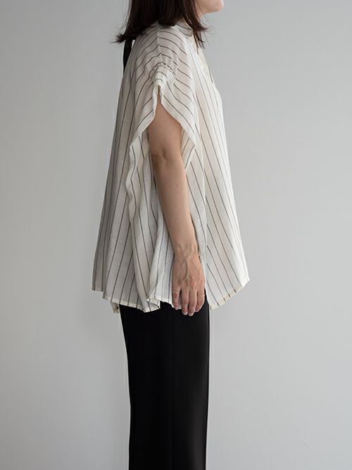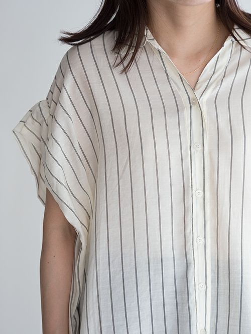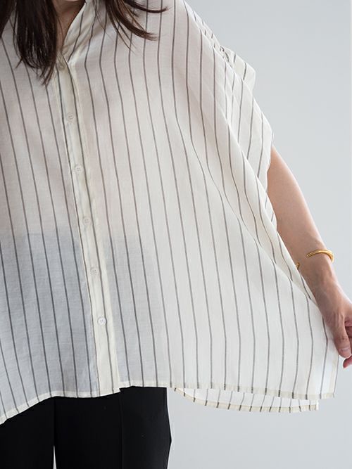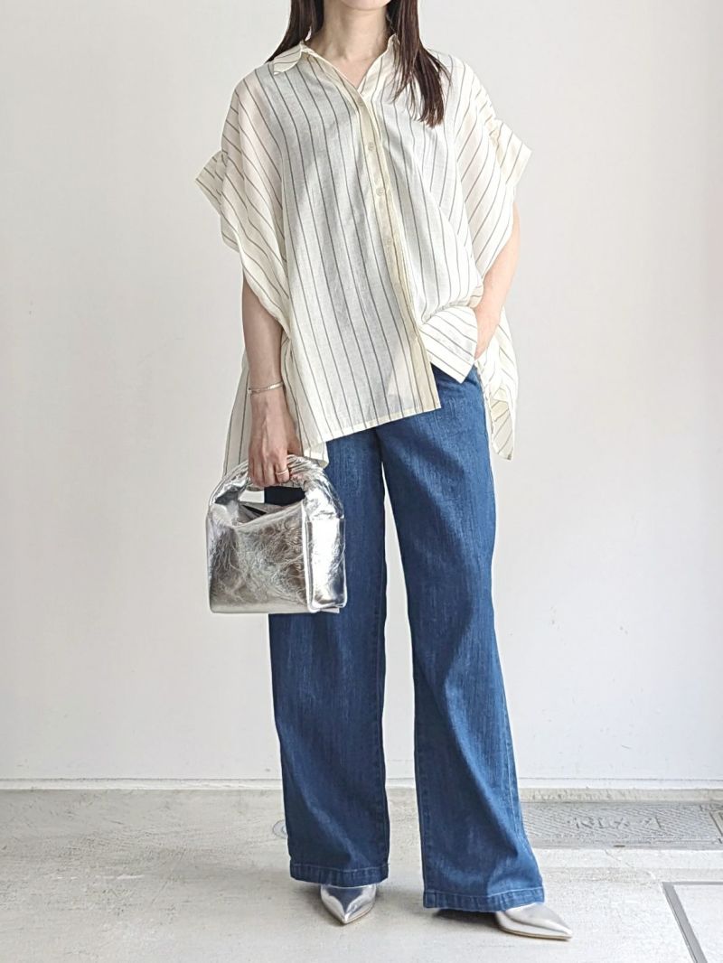 タイトなパンツはもちろん幅広アイテムとも相性がいいです。またスカートなどで合わせると少しフェミニンな印象になります。上品な光沢と落ち感のある素材なのでオンオフ幅広く活躍できるシャツです。