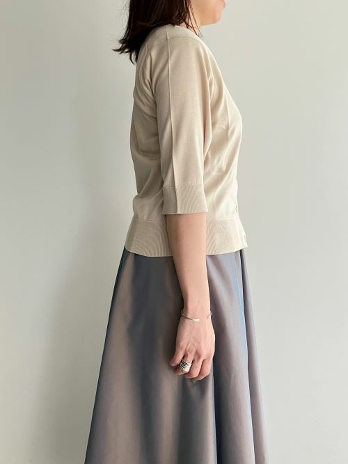 2023年シーズンにもご好評をいただいた人気のモデル。クラシカルかつ、トレンドでもある半袖カーディガンは、羽織としてはもちろん、前ボタンを閉じてミニマルなプルオーバーとして着用するのもおすすめ。