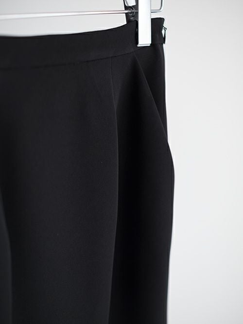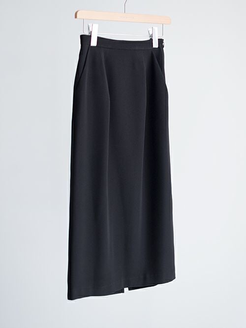 フォーマルで使えるブラックスカート。適度な肉感が体のラインを拾い過ぎず、滑らかに落ちるシルキーなツインダブルクロスを使用しており、女性らしい美しいシルエットが特徴。流行り廃りのないシルエットで、長く着て頂けます。皺になりにくいポリエステル素材で、ご自宅での手洗いが可能です。