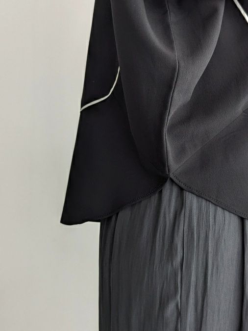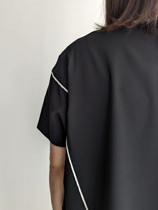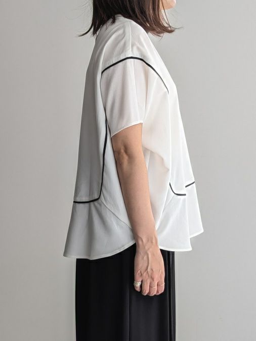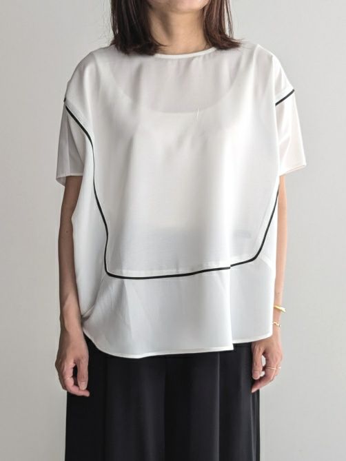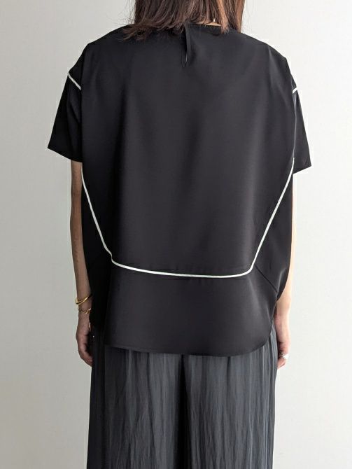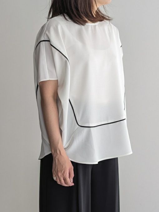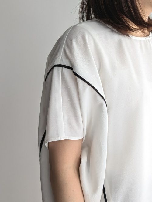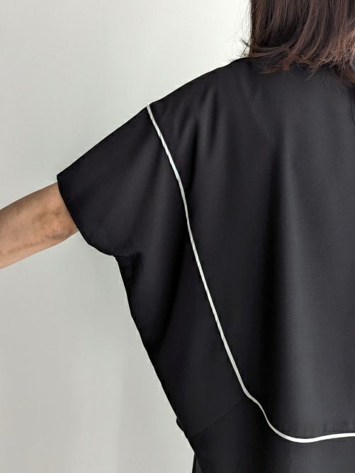 レーヨン特有の吸湿性と上品なドレープ感が魅力。軽やかでさらりとした着心地の一着。シンプルなデザインの中に細めのライン状のパイピングがアクセントとなり、ドルマンスリーブの程よい落ち感が美しいシルエットを演出します。
