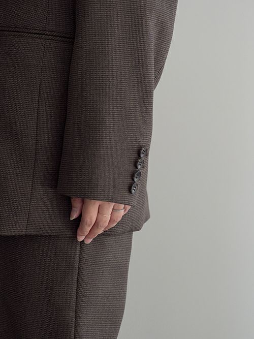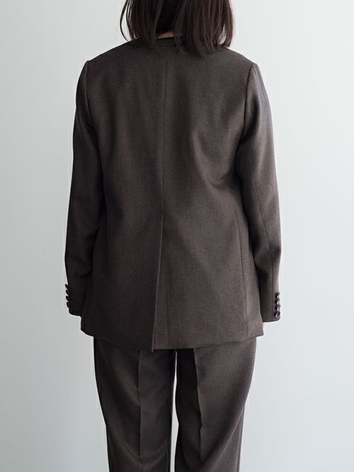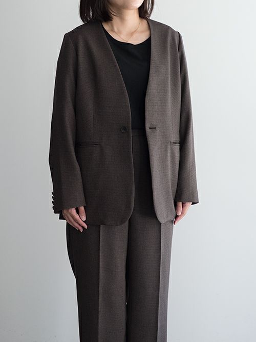ポリエステル素材のノーカラージャケット。シワになりにくく、ご家庭でのケアができる生地になります。