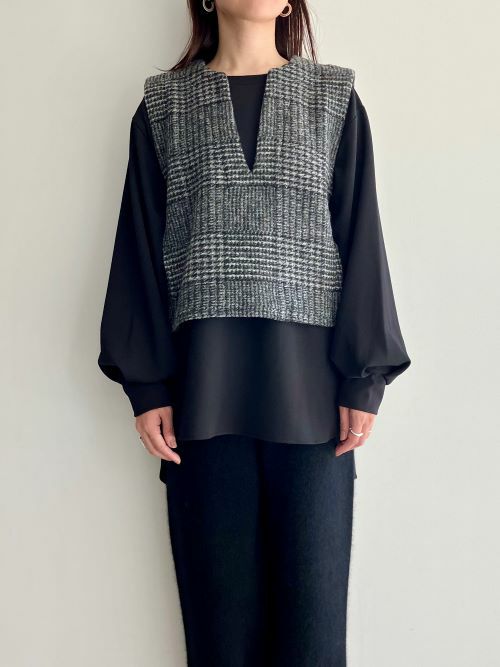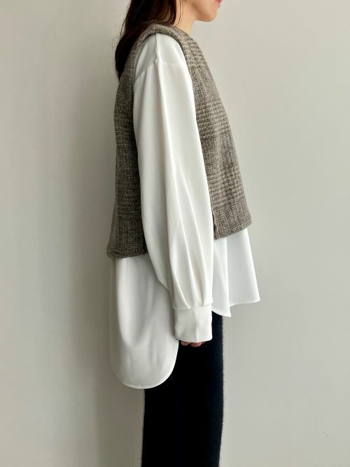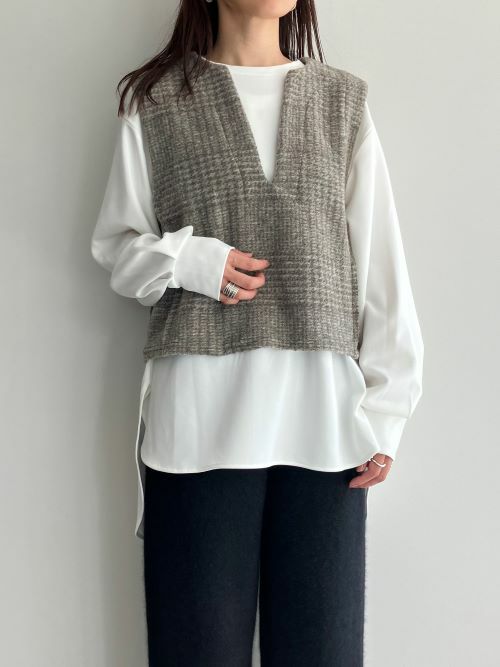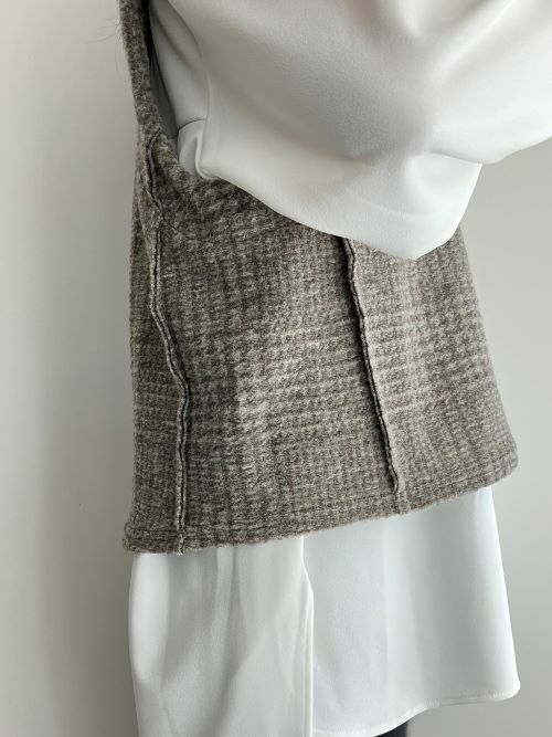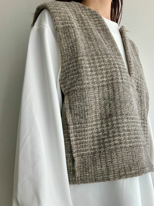 Vネックニットベスト。 ミドルゲージなので適度に目が詰まっており、それでいて軽く柔らかく暖かい素材です。 身頃、アームホールはゆったりめ、着丈は前後差があり前がショート丈のバランスが取りやすいサイズ感です。切り替えラインは縫い代外出しのカジュアルなディテールとなっております。旅行などにも意外とコンパクトで軽いので重宝します。