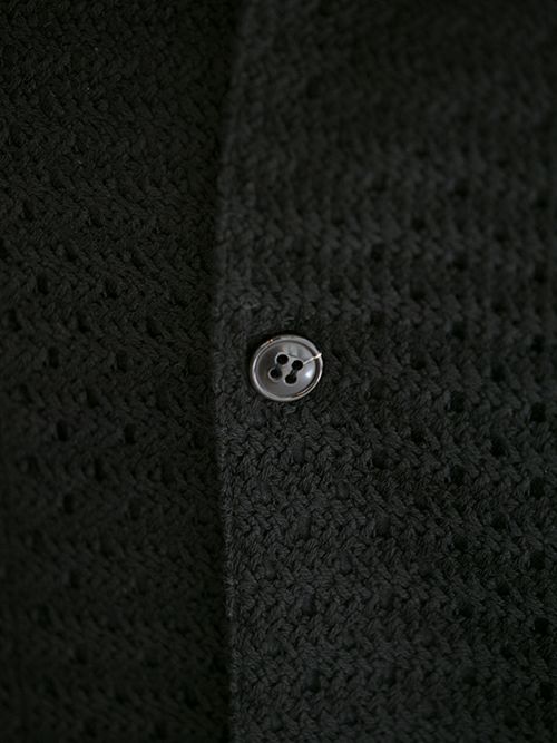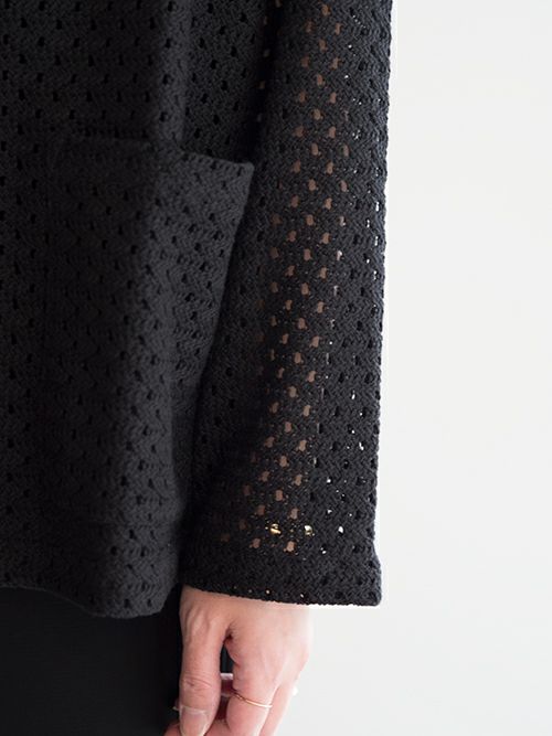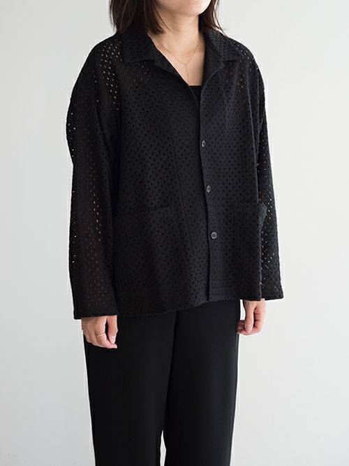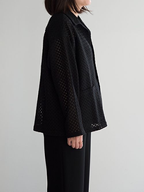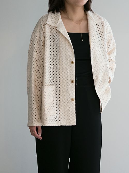太番手の糸をざっくりとしたラッセル編みで仕上げたレースジャケット。ニットに比べて型崩れしにくい性質を持ってます。
