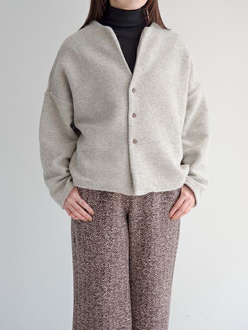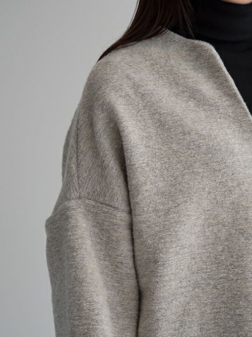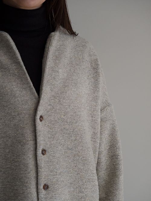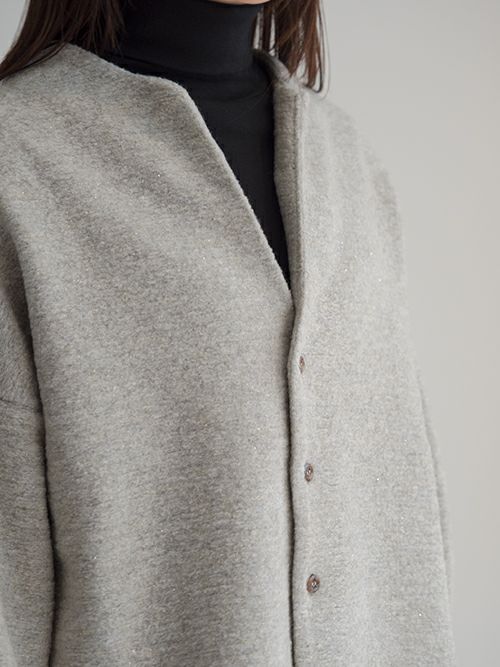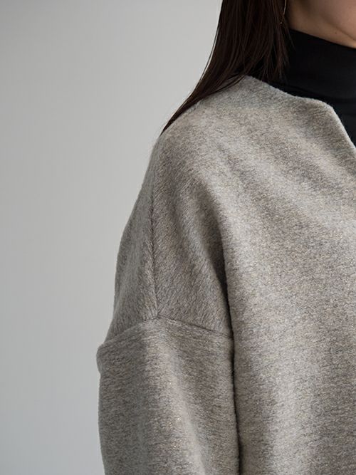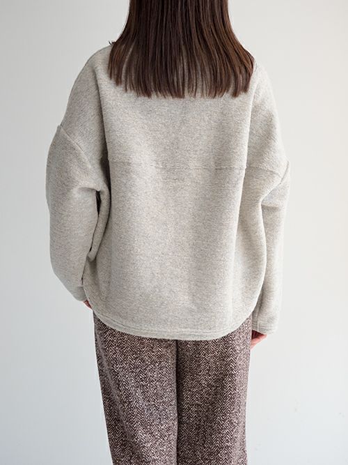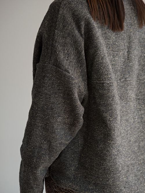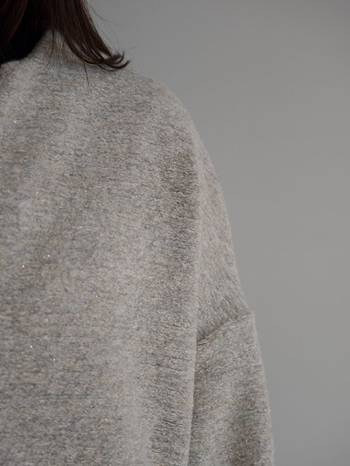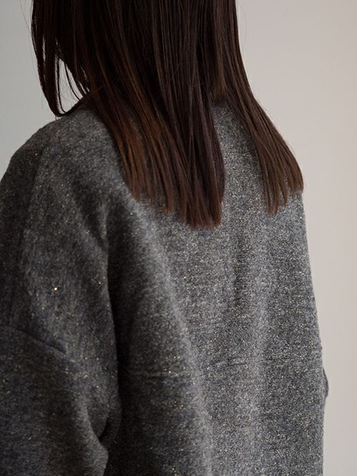 ミドルゲージで程よく目が詰まった編み地は、軽やかで柔らかく、そして心地よい暖かさを感じられる上質な素材。イタリア製ファブリックならではの美しい杢調の無地に、さりげなく織り込まれたゴールドラメが上品なきらめきを添えます。少し後ろに抜けるようなリラックス感のあるシルエットが魅力。後ろ身頃やアームまわりにたっぷりとしたボリュームを持たせることで、動きのある立体感とこなれた雰囲気を演出してくれます。