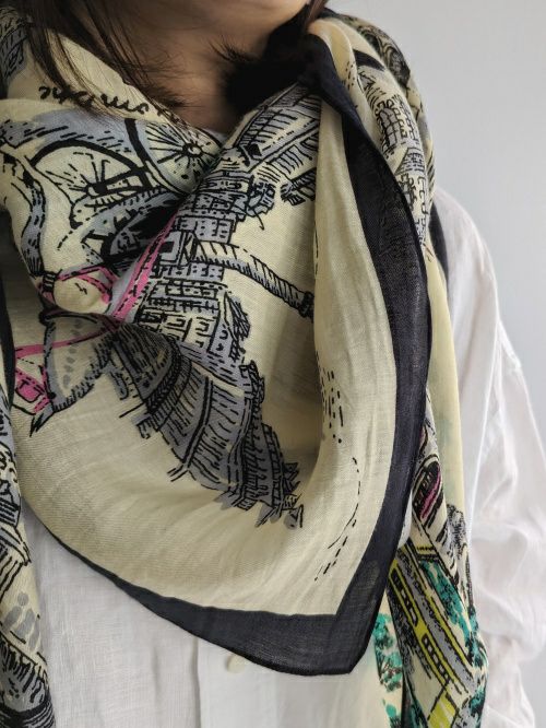 ヴィンテージスカーフからインスピレーションを得てつくられるスカーフは、素材やサイズにもこだわりを持ち、どんな巻き方でも美しく見えるよう計算されています。