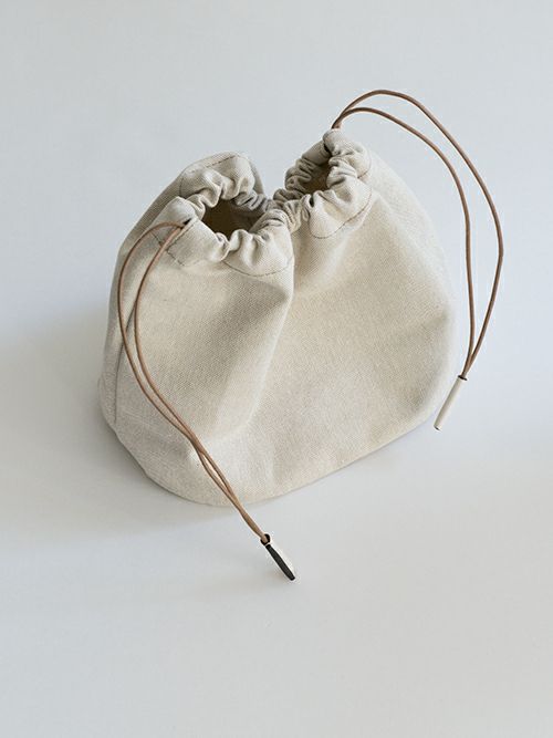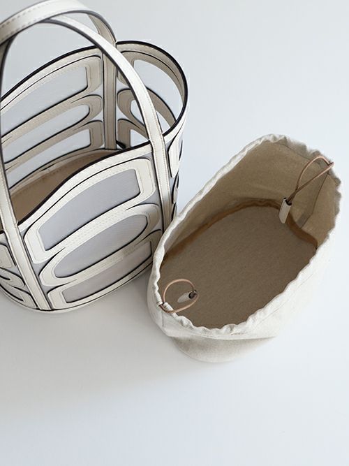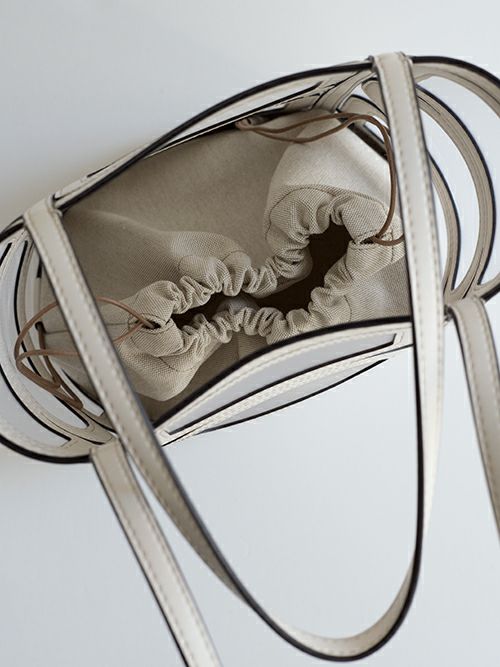 ハンドルは肩にかけられる長さで、とても軽いのも特徴です。内装に少し小さめの巾着がセットされていますので小物の収納やビジュアルにも配慮されております。